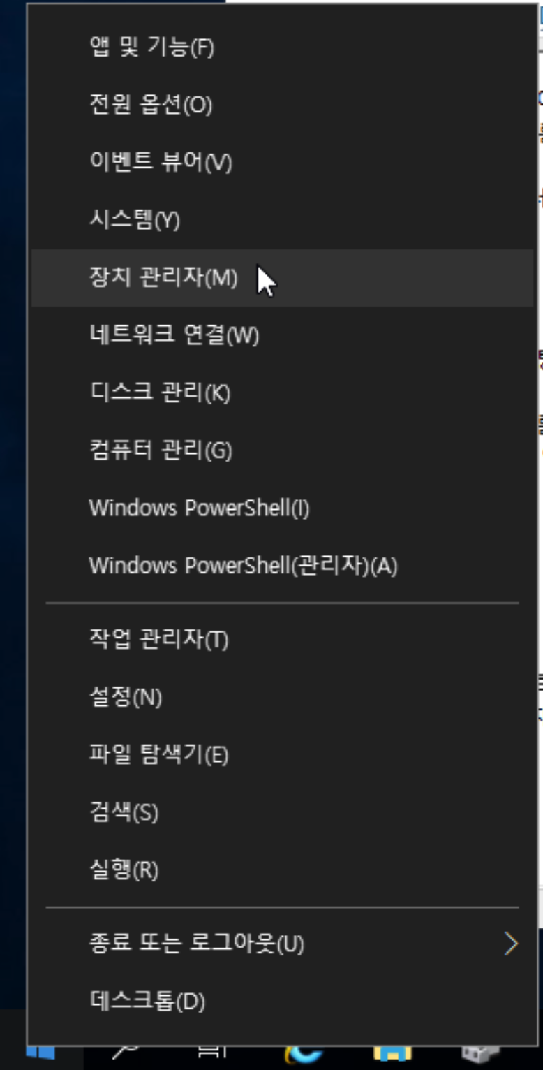 윈도우 로고 우클릭 > 장치 관리자