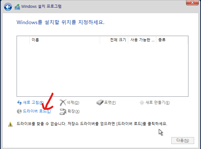 드라이버가 없기 때문에 드라이버 로드를 클릭하여 드라이버를 불러와야 한다.